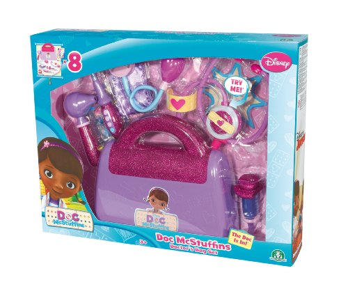 Sac Une aire de jeux Doc McStuffins Doctor comprend 8 pailleté et scintillant morceaux - le sac de Doc, jeu thermomètre, seringue, le brassard de pression artérielle avec jauge de travail, otoscope, brassard de bandage, une feuille d'autocollants, et bien sûr, la lumière magique de Doc stéthoscope! Maintenant votre petit Doc peut exercer ses compétences et de nourrir ses jouets préférés retour à la santé parfaite.