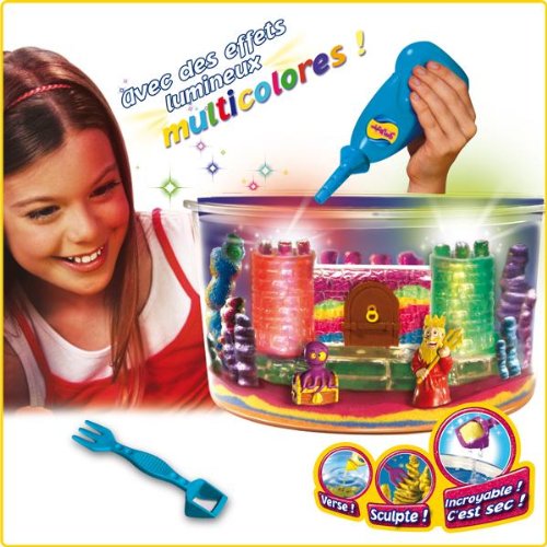 Un jeu plein d'imagination et de créativité! Inclus dans le coffret : 1 base qui illumine le château de plusieurs couleurs différentes (LED) /2 figurines (le roi Neptune et la pieuvre sur le coffre à trésor)de sable.